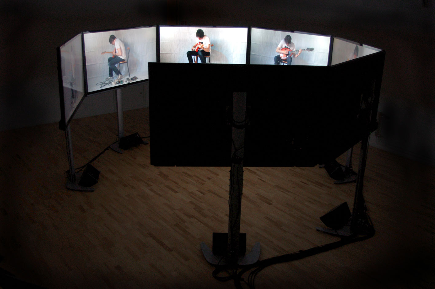 Commissioned by Stockholm Music & Art 2014 Seven channel video and sound, presented on 72" LCD monitors